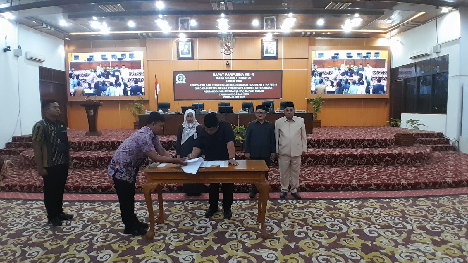 Demak, Matapadma – DPRD Kabupaten Demak, Jawa Tengah menggelar Rapat Paripurna ke-9 Masa Sidang ke-1 Tahun 2026 pada Jumat, 24 April 2026 di ruang rapat paripurna DPRD Demak. Agenda utama rapat tersebut adalah penetapan dan penyerahan rekomendasi atau catatan strategis DPRD terhadap Laporan Keterangan Pertanggungjawaban (LKPJ) Bupati Demak Tahun Anggaran 2025.